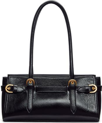Buckled straps cinch the slender profile of an East/West shoulder bag suspended from a pair of rolled shoulder straps for comfortable carry.