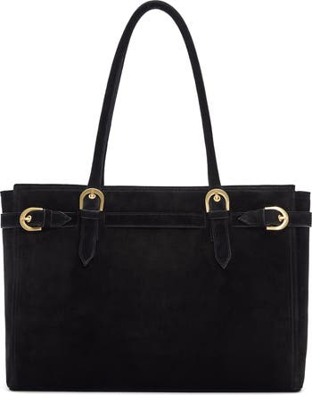 Buckled straps cinch the voluminous and structured profile of a wear-anywhere leather tote suspended from a pair of rolled shoulder straps for comfortable carry.