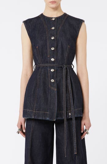Max Mara's experimental counterpart tilts denim into tailored territory with this inky indigo vest, where sculpted seams traced in contrast topstitching define the hourglass design. Silvery S-shaped rivets authenticate the look as signature SPORTMAX.