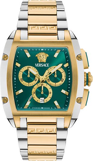 A rounded rectangular body contemporizes a stainless steel bracelet watch outfitted with chronograph movement and branded with the Medusa head and Greca engraving.