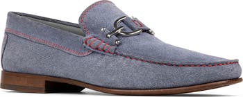Polished bit hardware adds a distinguished finishing touch to an Italian-crafted suede loafer grounded by a cushioned footbed for comfortable wear.