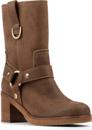 The edgy toughness of the polished hardware, harness detail and block heel on this moto-style boot is balanced by the cushioned memory foam and flexible rubber sole, offering both a timeless look and lasting comfort.