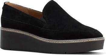 Modern, minimalist style defines a wedge-heel loafer featuring a streamlined silhouette and generous memory foam cushioning.