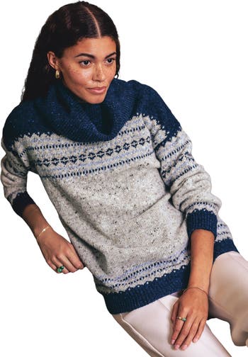 Crafted in 100% Donegal wool, the oversized cowl neckline and drop shoulder boxy fit of this sweater provide both style and comfort. Colour blocking and a fair isle pattern across the yoke and hem add a modern take on a traditional pattern.