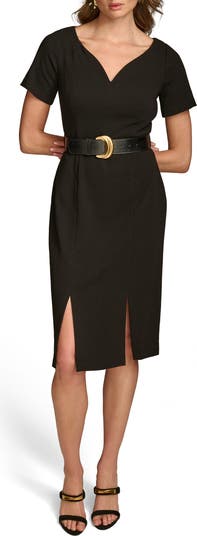 Dual slits on the front add modern interest to this sophisticated sheath dress showcasing a gleaming goldtone buckle on the croc-embossed belt.