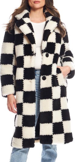 A bold check pattern puts a bold retro spin on this longline coat in plush high-pile fleece.