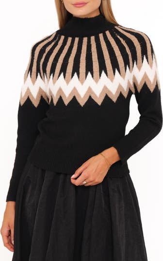 Elevated Fair Isle patterning details a cozy mock-neck sweater that belongs next to a roaring fire as you sip hot chocolate.