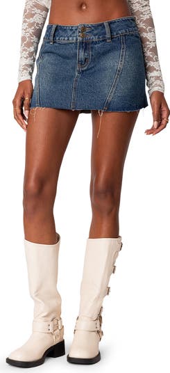 A low rise, angled seams and a raw-edge hem elevate this nonstretch-denim skirt cast in a classic blue wash that pairs well with almost anything.
