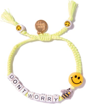 Stay worry-free with our charming Don't Worry Bee Happy Bracelet. This fun friendship bracelet features ceramic bee and smiley charms to spread joy and positivity. Keep buzzing with a playful reminder to always stay happy.