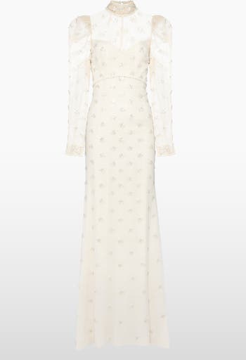 A high, embellished neckline and beaded cuffs frame the design with intricate detail, echoing the hand-worked artistry seen throughout the gown. The structured bodice beneath the sheer overlay offers a flattering fit, balancing contemporary simplicity with vintage allure.