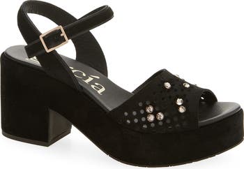 Scattered jewel embellishments and geometric perforations bring stunning dimension to a Spanish suede sandal lofted by a soaring platform and block heel.