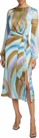 DORIA Long Sleeve Midi Dress with Waist Tie in Abstract Swirl Print