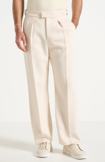 These Textured Pleated Tailored Trousers in Cream feature a relaxed fit and pleat to crease detail for a stylish and comfortable look. With self-adjusters at the waistband and side slip pockets, these trousers offer both a convenient and customisable fit.