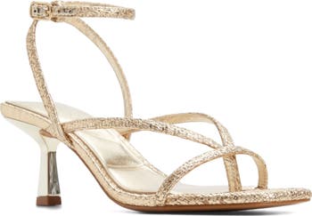 Slender straps underscore the minimalist profile of a square-toe sandal lofted by a sculptural flare heel for walkable height.