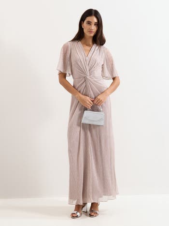 Gently draped maxi with sculpted twist front and flutter sleeves, it skims the silhouette for confident evening moments and celebration-ready glamour.