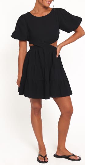 Darling puff sleeves and a flared skirt sweeten the silhouette of this leggy-length dress made with a cutout back.