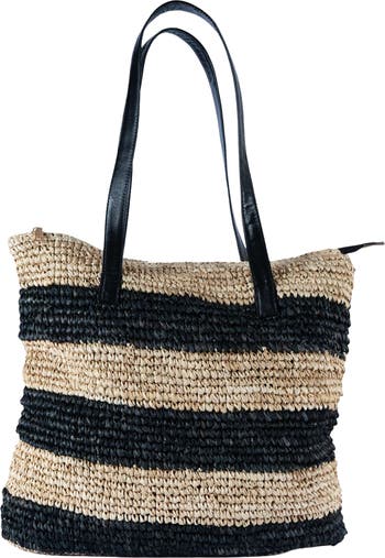Colorblock raffia creates textural interplay on a softly structured tote fitted with smooth leather straps and a spacious lining for style and convenience.