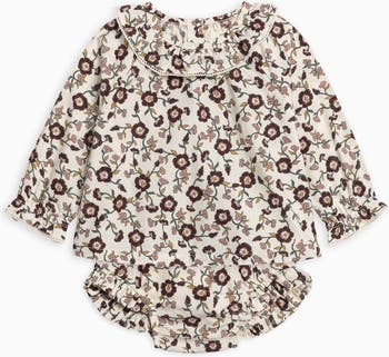 Vintage-inspired and made for sweet days ahead, the Dorothy Set combines timeless details with all-day comfort. The ruffle-collar shirt features scalloped lace trim, gathered raglan sleeves, and a wood button closure. Paired with a matching bloomer featuring ruffled elastic leg openings, this set is picture-perfect for any season.