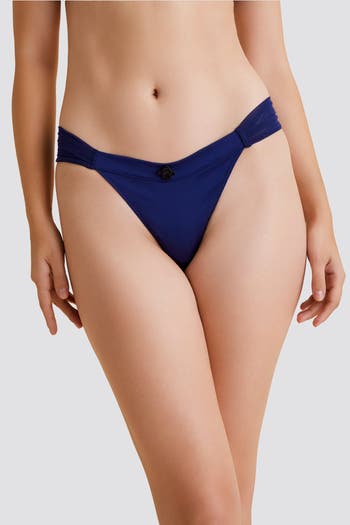 When dusk fades to night, the deep ‘Navy’ shade of the ‘Dorothy Thong’ reveals its true beauty. Designed with a high-cut profile that traces the curve of your hips, it’s crafted from contrasts of the finest Italian silk and exquisite, high-quality mesh.
