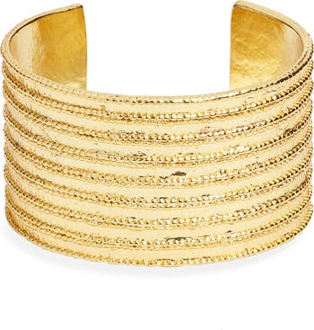 Lines of beads and hammered detailing gives dimensional shine to this handmade cuff bracelet finished with a 24-karat-gold plate.