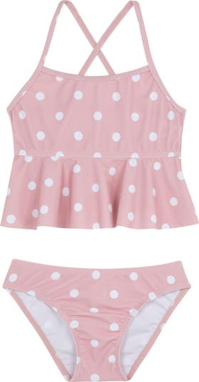 Dive into fun with the Dot Dot Dot Scoop Neck Ruffle Swim Set! This set features a playful polka dot design and back cross straps. The coordinating hipster bottom offers a comfortable fit. Made for comfort and durability, it offers built-in UPF protection and chlorine resistance for long-lasting wear.