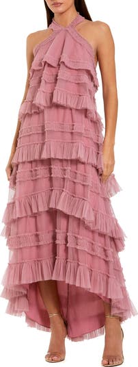 This ankle-length dot mesh dress features a ruffled halter neckline and soft, fluttery layers that create a romantic, airy silhouette.