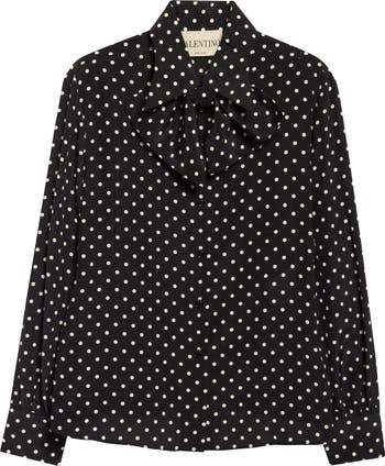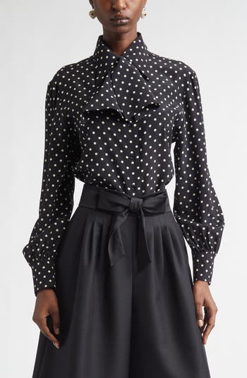 Polka dots dapple this drapey silk crêpe de chine shirt fashioned in Italy with a curvy sideswept collar and soft bow.