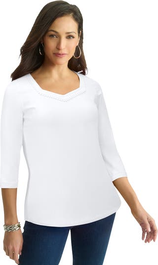 The sweetest tee in your wardrobe. Crafted in a timeless silhouette with an ultra-soft cotton blend, this top is detailed with a feminine dot trim at the sweetheart neckline and sleeve cuffs. Pair it with dress pants for the office or jeans for weekends. Straight silhouette. Sweetheart neckline with dot trim. Three-quarter sleeves. Dot trim around sleeve cuffs. 28" length. Cotton/spandex. Machine washable. Imported.