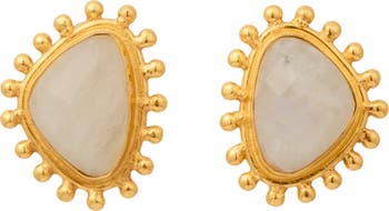 Gold plated brass Earrings "Dots" - Chic gold-plated studs featuring triangular moonstone centers framed by a playful beaded edge. Effortlessly elegant with a modern, radiant touch.