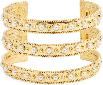 Polished studs and lustrous faux pearls accentuate the geometric design of this stunning cuff bracelet plated in 24-karat gold.