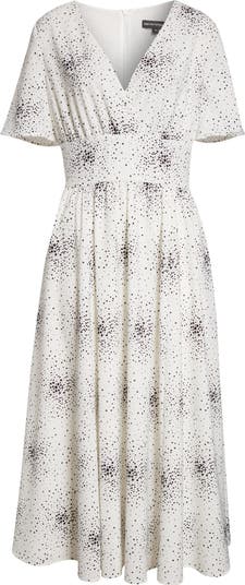 Soft pleats and a wide banded waist define this dotted midi dress framed by fluttery sleeves and a flouncy midi-length skirt.