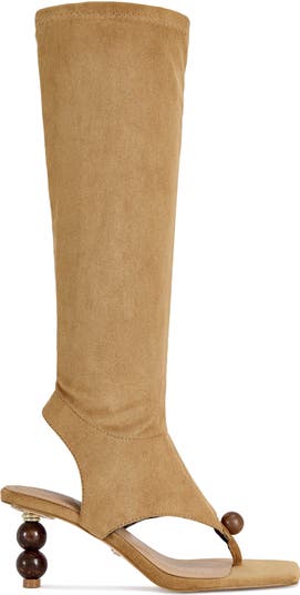 Cecile, but with a little more je ne said quoi. Faux suede thong heeled sandal with bohemian wood sphere accents lining the stiletto detailing at the toe-artful, effortless, and quietly statement-making.Heel height: 2.5"Shaft height: 15.25"Calf circumference: 13"