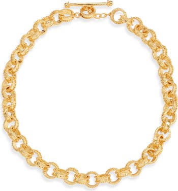 Chunky, 24-karat gold plated links framed in dots connect on this texturally rich handcrafted necklace.