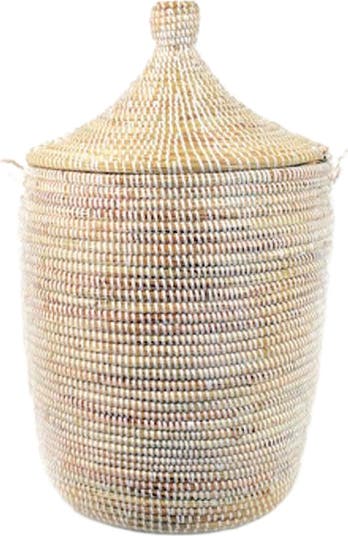 This versatile Medium White Basket adds a touch of hand made global decor to any room. A perfect storage container, it has both practical functionality and a minimalist contemporary look that would look at home in practically any space. Use it as a hamper for small towels in the bathroom or socks in your closet, small toys in a kid’s room or hats and gloves in your entryway - its uses are endless! It also looks great with the other white baskets in the set as a focal point in any room. Wolof women in rural Senegal weave these baskets from millet grass, and white plastic threads which add strength and durability.