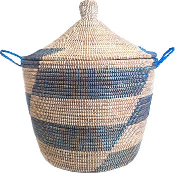 Wolof craftswomen in Senegal weave these beautiful and functional large hampers from millet grass and recycled plastic. This African basket features an alternating blue and white stripe that can add a pop of color to any room. Large enough to be storage solution for towels or laundry, and stylish enough to be a focal point to any space.