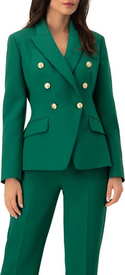 - Tailored and bold, this structured green blazer features a double-breasted front with gold-tone crest buttons