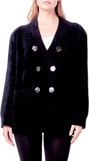 Feel the warmth and polish of this fuzzy-textured longline cardi designed in a double-breasted silhouette with oversized high-shine buttons.