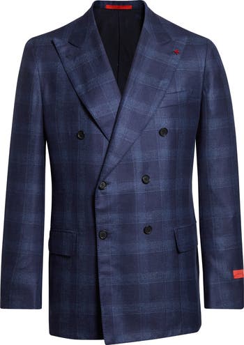 Expertly tailored in Italy from a smooth blend of silk and cashmere, this modern double-breasted jacket is executed in a subtle blue-on-blue plaid and edged with meticulous pickstitching.