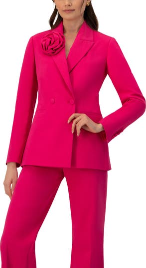 Sleek blazer featuring a double-breasted front and a floral detail on the lapel.