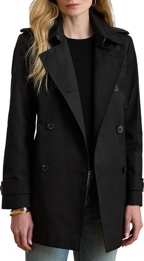 A pared-back take on trench coat style is cut to a shorter length but still includes many of the classic details, from collar to shoulders to cuffs.