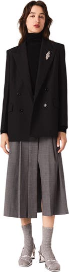 This suit jacket embodies structured elegance with a couture twist. Its straight, double-breasted cut creates an assertive silhouette, while the removable brooch adds a precious touch. The meticulous finishing and fluid fabric make it a timeless statement piece for any wardrobe.Wear it over a thin turtleneck and a pleated midi skirt to play with volume, and accessorise with sandals and a pair of socks. A new take on tailoring, the Maje way.