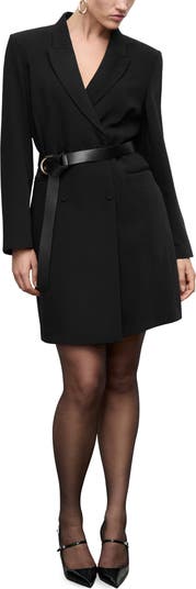 A longer length strikes a modern mood for a double-breasted blazer closed with covered buttons.
