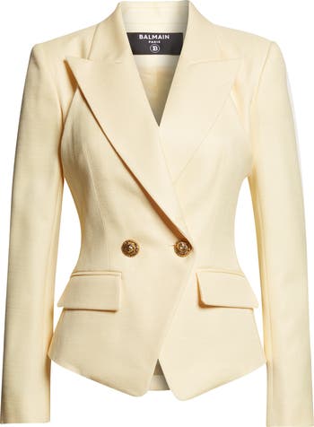 This expertly tailored jacket is cut from textural natte fabric, a basket weave made with contrasting colors in the warp and weft for subtle contrast. Wide peaked lapels accentuate the sharp shoulders and cutaway front of this sophisticated jacket fastened with signature goldtone buttons at the waist and cuffs.