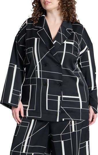 An oversized satin blazer with notch lapel and artful sleeve vents.