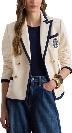 High-polish medallion buttons and crest-style monogram embroidery at the chest create a regal aesthetic in this tailored piquè blazer traced with bold contrast trim.