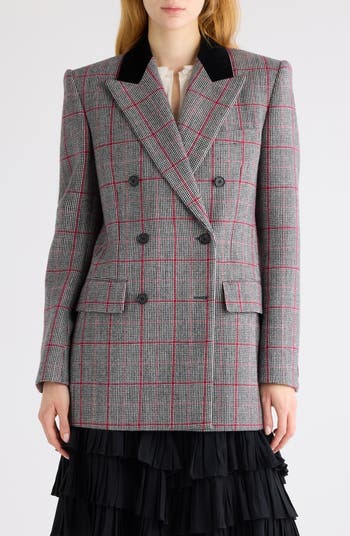 Glossy horn buttons punctuate this impeccably tailored blazer cut from sumptuous virgin wool and layered with a silk lining for a feeling of quiet luxury. Contrasting peaked lapels create sharp visual definition against structured shoulders, delivering a double-breasted silhouette that exudes understated authority.