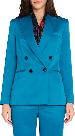 Rich glossy satin gives work-to-play potential to this polished blazer made in a classic double-breasted silhouette.