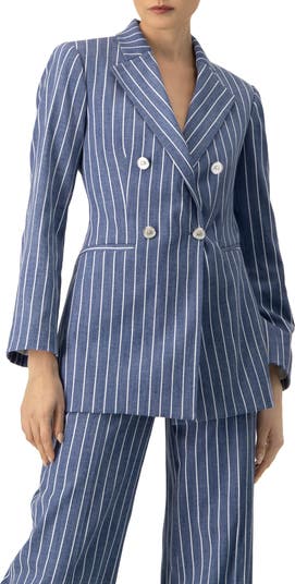 Stylish double-breasted blazer featuring a notched lapel and classic stripe pattern.