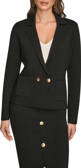 Classic details like structured knit and double-breasted silhouette make this sweater blazer a timeless wardrobe workhorse.