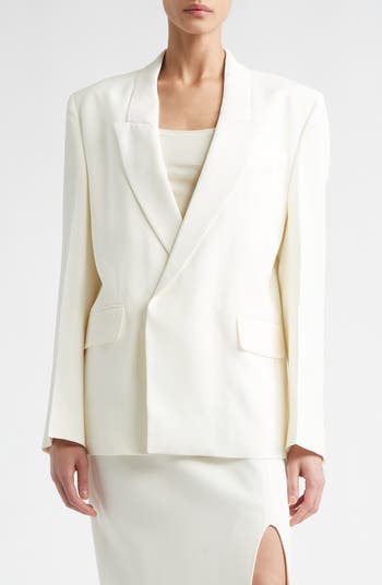 Expertly tailored for a loose fit and ‘70s feel, this suit jacket embodies the glamour of black-tie occasions. Designed in classic tuxedo style, it’s cut in a boxy silhouette with structured shoulders and peaked lapels.